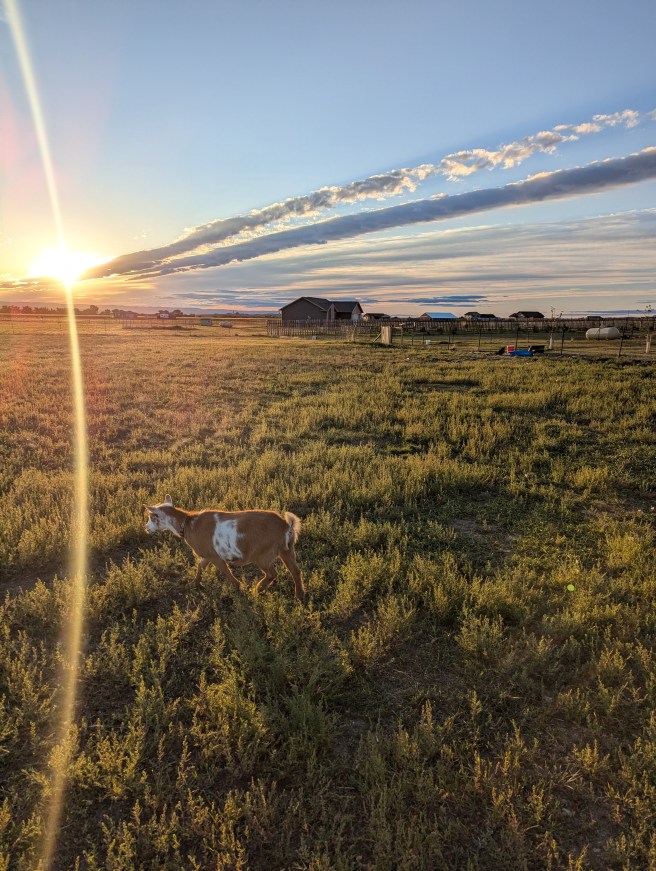 Lastly, were the lovely goats. I am still milking one doe, who I brought to the shed only to have her decide she didn’t want to go into the shed. She tried to run away, I grabbed her, she pulled and my feet flew out from underneath and I busted my butt. The goat feed I had in my scoop went flying, I said a few choice words, got up, and finished the job. However, while I was milking her I had a guest join us in the milking shed. One of the bucks is small enough to squeeze through the gate crack and came into the shed looking for food. He of course proceeded to jump onto the milk stand, while I was milking, and I had to stop milking and drag him off. So, now I need to finish milking but I smell like a stinky buck. Eventually, I got everything done but the chores that usually take about 20-30mins took an hour.