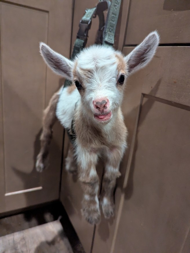 Little Ember is doing great. I however am a bit sleep-deprived. She is so tiny, so I make sure to get up every night at 2am and give her a bottle. She spends most of her day in the pasture with the big goats and sleeps with our other baby (Astrid) at night in the shed. They both love to run around the pasture and do the biggest little jumps you have ever seen. If nothing else, baby goats are super entertaining. It is a joy to watch them play together. It doesn’t fix everything but having them makes it a little better.